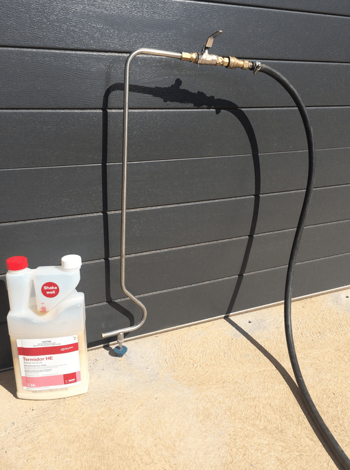 Termidor is then injected through holes at a pressure of 60 psi and at a quantity of 2 litres per hole. For trenches, we immerse Termidor into the soil from the footing to ground level using no less than 10 litres per metre.